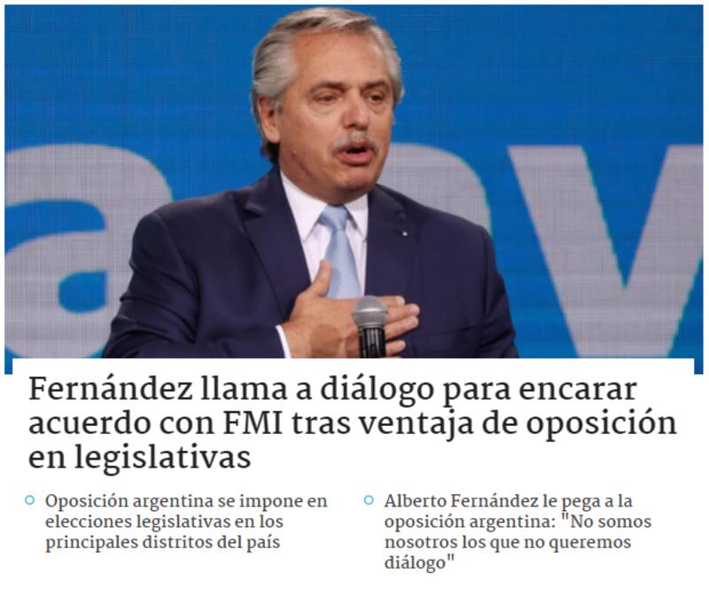 En El Mundo destacaron como el presidente Alberto Fernández"celebró el "triunfo" y anunció una "nueva etapa" en la que presentará un plan económico y cerrará un acuerdo con el Fondo Monetario Internacional", pese a haber perdido las elecciones por casi nueve puntos a nivel nacional.