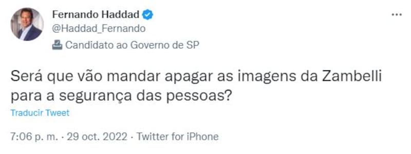 Por el contrario, Fernando Haddad, candidato a la gobernación de São Paulo e integrante del círculo político más cercano de Lula, fue de los primeros en posicionarse en contra: "¿Será que van a mandar a borrar las imágenes de Zambelli para la seguridad de las personas?"
