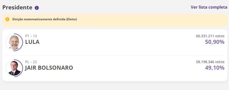 Hasta el momento, la página de resultados oficial del Tribunal Supremo Electoral (TSE) informa que ya se escrutaron un 58,36% de las mesas y que Lula da Silva (PT) se impone sobre Jair Bolsonaro (PL) por 56,79% a 43,21% de votos válidos, respectivamente.