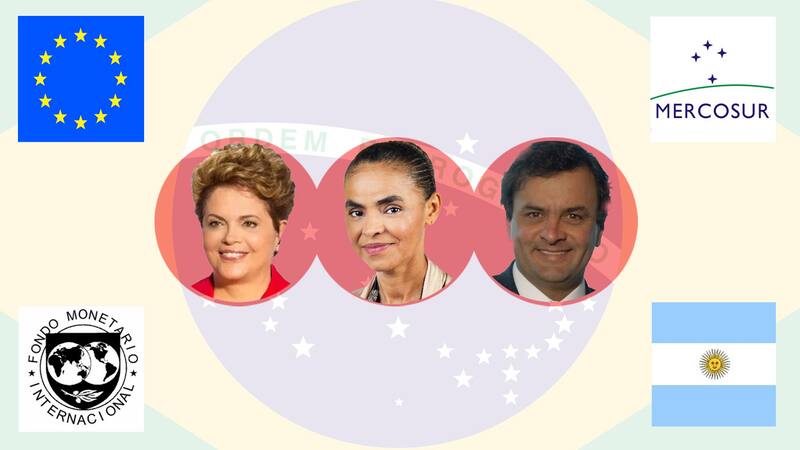 Política exterior: En este punto Dilma quiere darle continuidad a la mirada de la “Patria Grande” que iniciaron Lula, Hugo Chávez en Venzuela y Néstor Kirchner en la Argentina. Por eso quiere fortalecer el Mercosur, pese a los problemáticos vínculos comerciales con Argentina gracias a las trabas a las importaciones impuestas por el gobierno de Cristina Kirchner y los continuos pedidos de la oposición de que Brasil se acerque a la Alianza del Pacífico y ponga en marcha el Trado de Libre Comercio con la Unión Europea. En este último punto, Dilma afirmó que es necesario avanzar en la negociación con el bloque europeo, un poco en orden al análisis realizado por la Organización Mundial del Comercio (OMC) sobre la importancia de la apertura del mercado brasileño. Sobre el FMI, Dilma siempre se jactó sobre el desarrollo de su país evitando las recetas del organismo internacional. En conclusión: si bien los vínculos entre Argentina y Brasil han sufrido vaivenes, la proximidad ideológica se mantiene. Una victoria de Dilma le daría cierta continuidad al plan regional del gobierno argentino. El desafio: tonificar el vínculo comercial y la integración productiva.