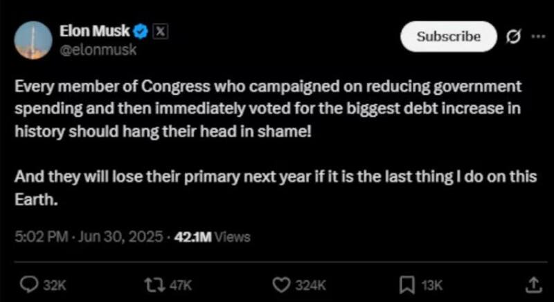 Tras haber destinado cerca de u$s 288 millones para impulsar a Trump y a candidatos afines, el dueño de X y creador de SpaceX cambió de postura tras la inminente aprobación del paquete de gasto público e inmigración impulsado por Trump, el cual aumentaría aún más la deuda pública estadounidense.
