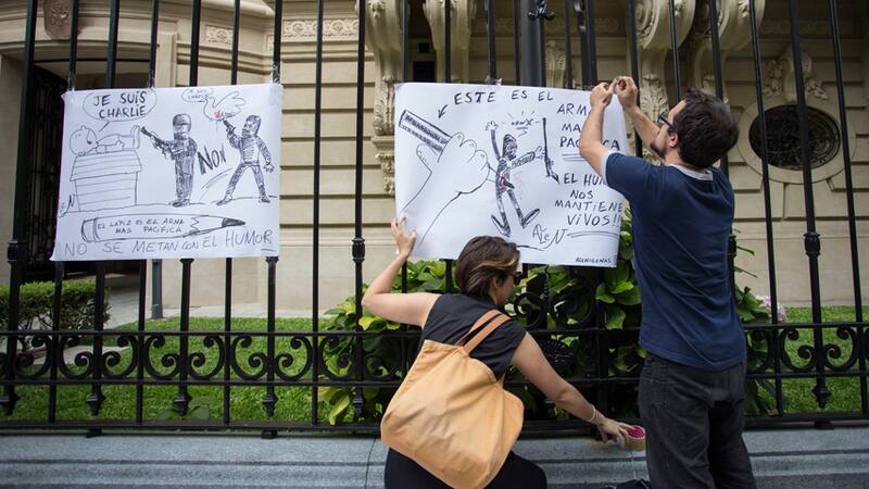 El miércoles, tras conocerse el hecho, decenas de personas se acercaron a la representación, donde, de manera espontánea, realizaron dibujos y mostraron carteles en homenaje a los periodistas de la publicación satírica parisina.