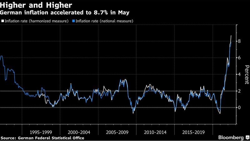 En tanto, la tasa armonizada utilizada por Eurostat para sus cálculos en la zona euro se situó en 8,7% respecto al año anterior en mayo, también un nuevo máximo histórico en la economía más grande del continente, y por encima del pronóstico de analistas encuestados por Bloomberg, que referían un avance del 8,1%