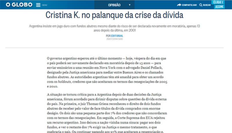 El diario O'Globo de Rio de Janeiro le dedicó un editorial al conflicto con los fondos buitres que podría llevar a la Argentina a un nuevo default después de 13 años.
