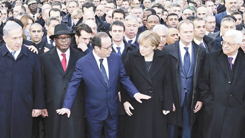 En la primera línea de la marcha en París, con los brazos entrelazados, avanzaron durante 300 metros el presidente anfitrión, Francois Hollande, y los jefes de gobierno de Alemania, Angela Merkel; de Israel, Benjamin Netanyahu; de Palestina, Mahmud Abbas; de España, Mariano Rajoy, el Reino Unido, David Cameron, e Italia, Matteo Renzi, También participó el secretario general de Naciones Unidas, Ban Ki-moon.