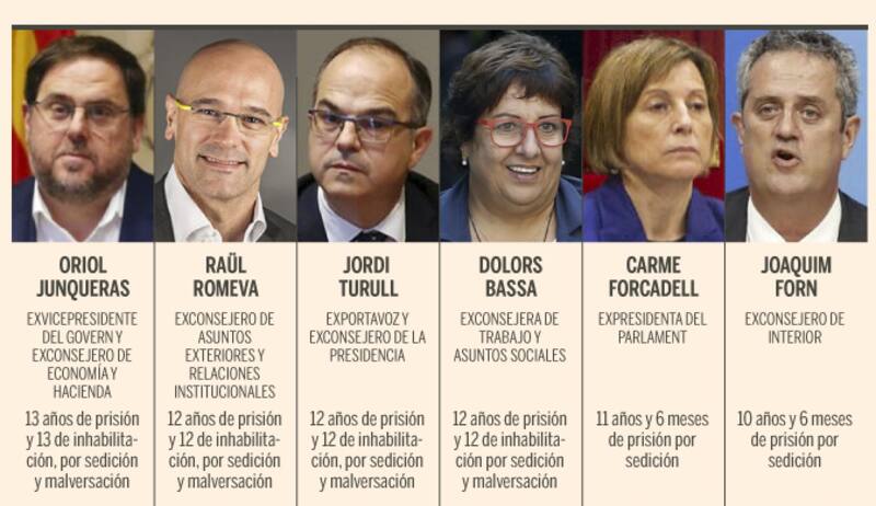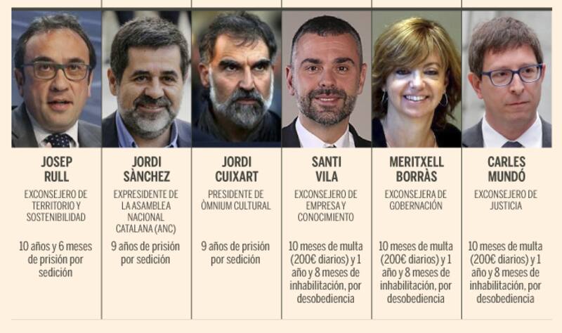 Los líderes sociales Jordi Sánchez y Jordi Cuixart recibieron una condena de 9 años de prisión e inhabilitación absoluta por sedición, por haber puesto a la Asamblea Nacional Catalana (ANC) y Ómnium Cultural, las organizaciones ciudadanas que presidían, al servicio de "la maniobra de presión política" ideada por el gobierno secesionista catalán, según los jueces. El ex jefe de la diplomacia catalana Raúl Romeva y los ex consejeros Jordi Turull y Dolors Bassa fueron condenados a 12 años de prisión e inhabilitación absoluta, también por sedición y malversación.