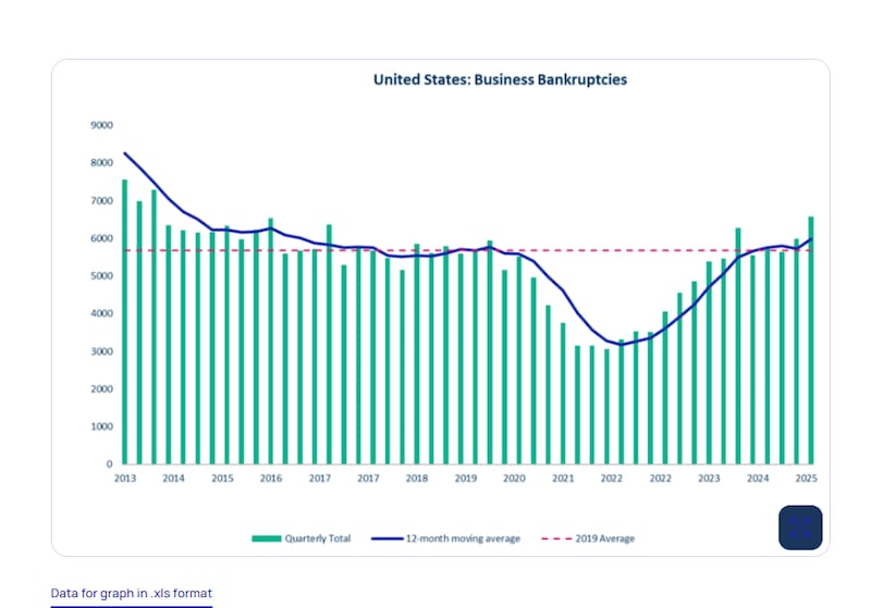 En línea con ese panorama, un informe privado de Coface, una aseguradora especializada en riesgo crediticio e insolvencias empresariales, indicó que las quiebras corporativas superaron de manera consistente los niveles previos a la pandemia durante 2025. Según ese relevamiento, las quiebras empresariales en EE. UU. alcanzaron las 6574 en el tercer trimestre de 2025, la cifra más alta desde el segundo trimestre de 2014 y un 15 % superior al promedio de 2019, marcando dos trimestres consecutivos por encima de los niveles prepandemia.