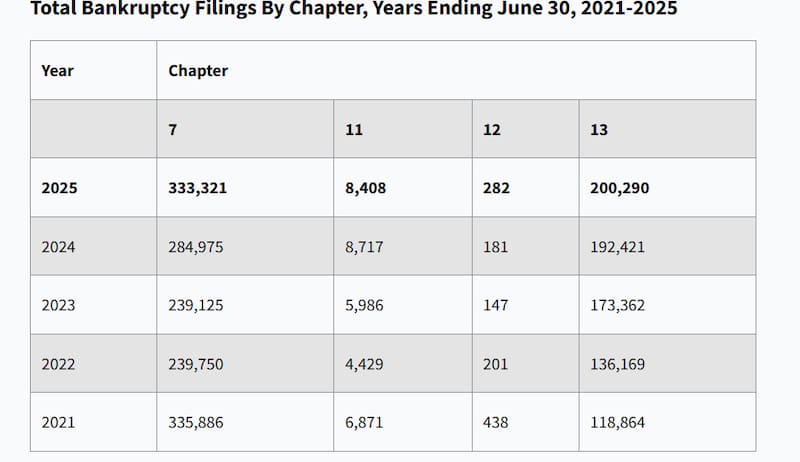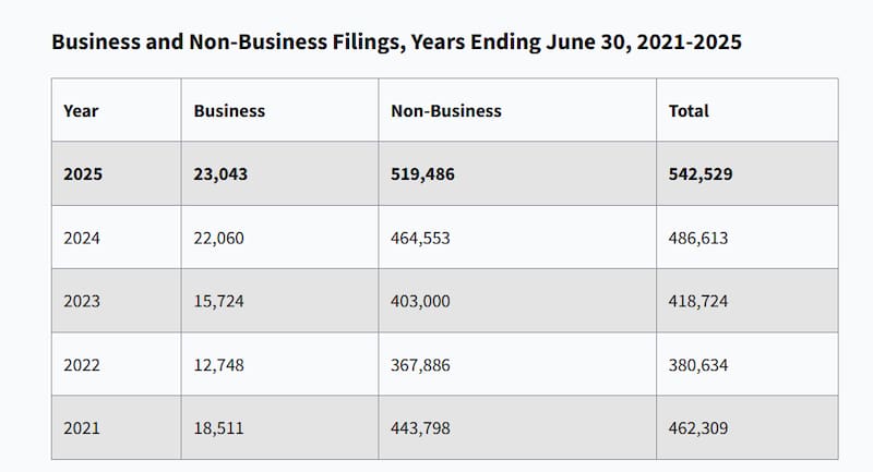 Las cifras judiciales también confirman la tendencia. La Administrative Office of the U.S. Courts, organismo oficial que consolida todas las presentaciones de bancarrota en el sistema judicial federal, informó que en los 12 meses finalizados en junio de 2025 las quiebras totales aumentaron 11,5% interanual, con 542.529 casos registrados.