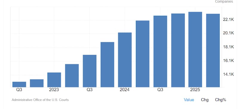 Los datos agregados de quiebras en Estados Unidos, que permiten ampliar la mirada más allá de las grandes corporaciones, pueden tomarse de Trading Economics, una plataforma que compila y sistematiza estadísticas oficiales provenientes de la Administrative Office of the U.S. Courts, el organismo judicial que consolida todas las presentaciones de bancarrota en el sistema federal. Estas estadísticas incluyen la totalidad de los casos judiciales, tanto individuales como comerciales, y abarcan desde hogares y microempresas hasta compañías de mayor tamaño.