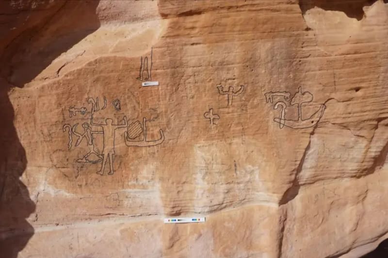 El panel de Wadi Khamila no quedó congelado tras su creación. A lo largo de los siglos, otras culturas dejaron su huella sobre la misma roca. Inscripciones nabateas (pueblo árabe que habitó la región entre el siglo IV a.C. y el I d.C.) y grafitis árabes se superponen parcialmente a la escena faraónica, transformando el panel en un auténtico palimpsesto histórico.