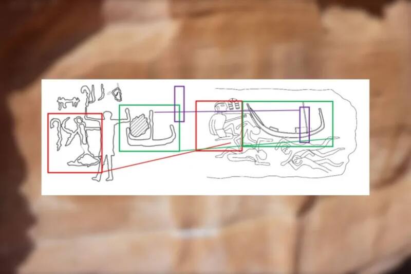 El panel rupestre descubierto es de una claridad perturbadora. Un hombre avanza con los brazos levantados en señal de triunfo. Frente a él, otra figura aparece arrodillada, con las manos atadas a la espalda y una flecha clavada en el pecho. A un costado se distingue una embarcación, símbolo tradicional del poder real egipcio.
