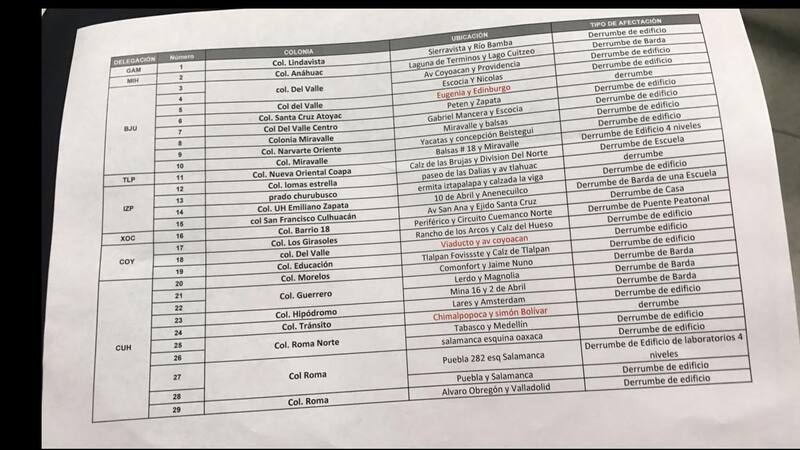 A continuación, el listado oficial elaborado por el Gobierno de la Ciudad de México que incluye las direcciones de los edificios afectados por el terremoto de 7.1 y 6.8 que en varios estados de ese país.