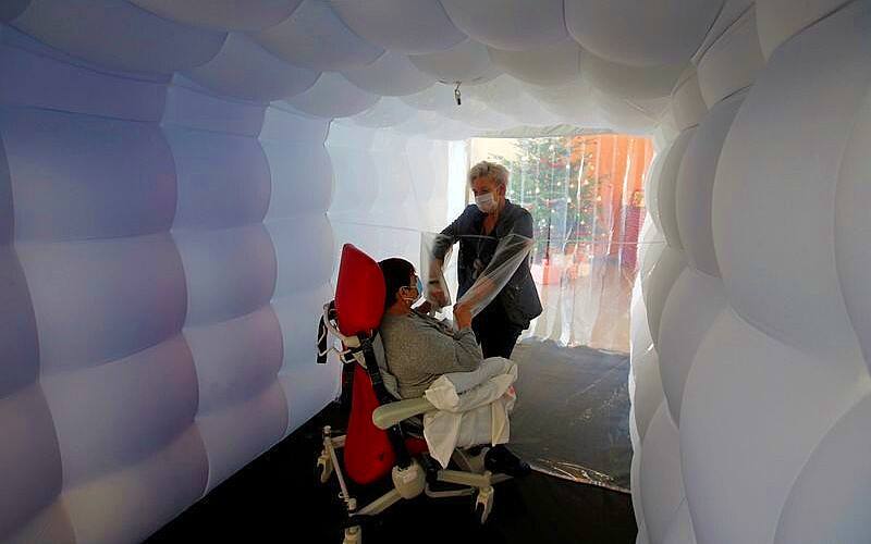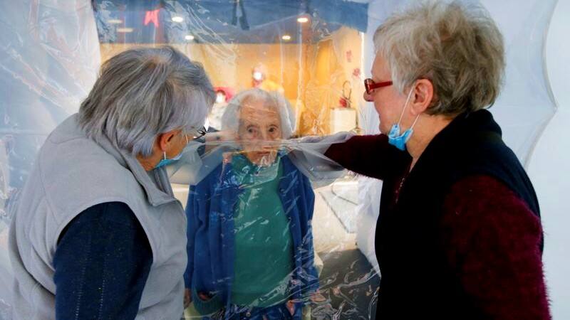 La "burbuja para abrazos" permite a los residentes del hogar de ancianos, aislados del mundo exterior para protegerlos del virus, tomarse de la mano y abrazar a los familiares que los visitan, porque en todo momento están separados por una película plástica sellada herméticamente.