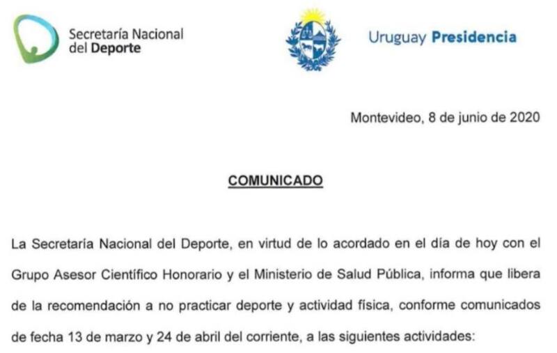 El comunicado de la SND expresa que "en virtud de lo acordado" este lunes "con el Grupo Asesor Científico Honorario y el Ministerio de Salud Pública, informa que libera de la recomendación a no practicar deporte y actividad física, conforme comunicados de fecha 13 de marzo y 24 de abril del corriente, a las siguientes actividades".
