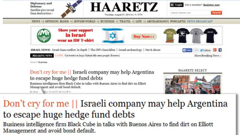 Haaretz, uno de los diarios más importantes de Israel, publicó hoy un artículo en el que señala la existencia de negociaciones entre el gobierno argentino y una empresa de inteligencia israelí para investigar al fondo buitre Elliot. “Black Cube, una empresa de inteligencia israelí, está negociando con el gobierno argentino para ofrecerle sus servicios”, describe en su primer párrafo.
