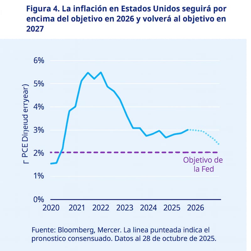 El informe destacó que el avance de la IA actúa como un punto de inflexión para la actividad económica internacional. Según Rupert Watson, líder global de Economía y Asignación Dinámica de Activos de Mercer: “Esperamos que la economía global se fortalezca un poco en 2026 a medida que disminuyan los vientos en contra del comercio y las políticas monetarias y fiscales se flexibilicen marginalmente”. Añadió que, en Estados Unidos, la Ley One Big Beautiful Bill Act (OBBBA) dará sostén fiscal y que “el auge continuo de la IA debería apoyar la actividad del mercado en EE. UU.”, en un contexto donde los balances de los hogares mejoraron tras varios años de subas bursátiles.