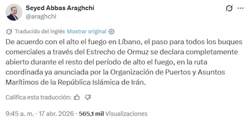 En medio de la tregua entre el Líbano e Israel establecida el jueves, el ministro de Exteriores iraní, Abbas Araghchi, anunció que -en línea con el alto el fuego que mantienen con Estados Unidos- queda “totalmente abierto” el paso de todos los barcos comerciales por el estrecho de Ormuz mientras dure el acuerdo.