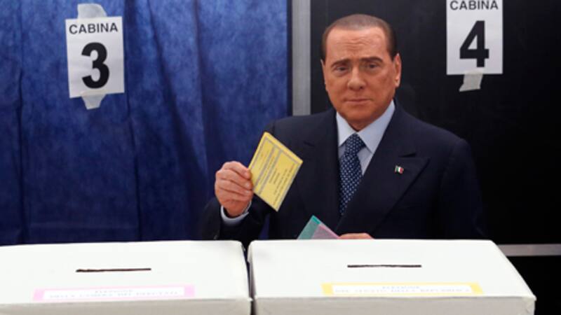 "Il Cavaliere" depositó su voto en medio de protestas feministas en un colegio electoral de Milán, donde fue recibido por tres jóvenes desnudas, integrantes del colectivo feminista Femen.