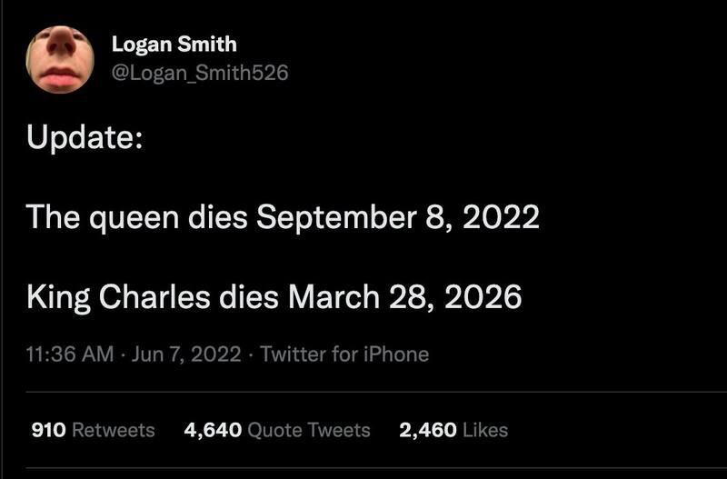 El 7 de junio de 2022, el usuario identificado como @Logan_Smith526 escribió en Twitter que la Reina Isabel iba a fallecer "el 8 de septiembre de 2022".
