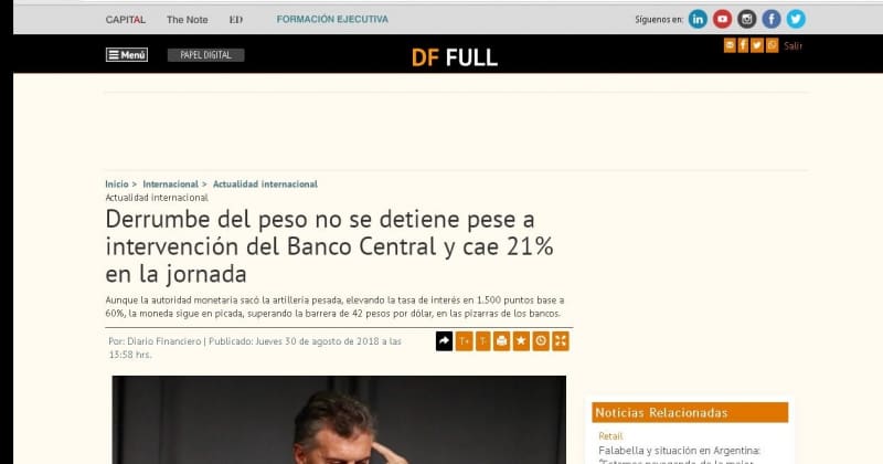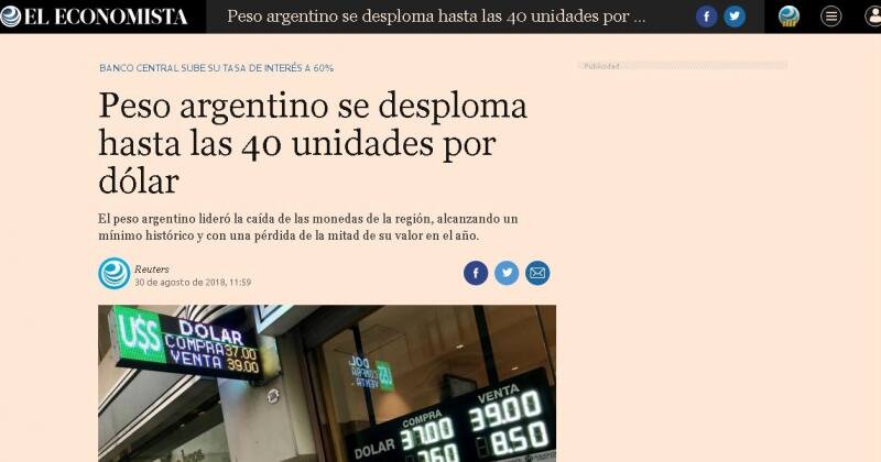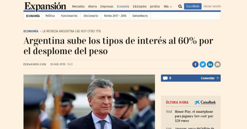 El periódico español Expansión indica que "el peso argentino se ha devaluado alrededor de un 70% frente al dólar en lo que va de año. El Gobierno de Macri descarta que el país vuelva a caer en la suspensión de pagos".