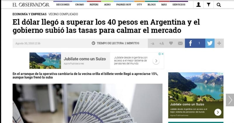 El Observador de Uruguay considera que "el dólar parece no encontrar un techo en Argentina tras la fuerte devaluación de este miércoles. El gobierno movió rápido y subió las tasas para calmar la corrida cambiaria este jueves, pero la medida tuvo un efecto acotado".