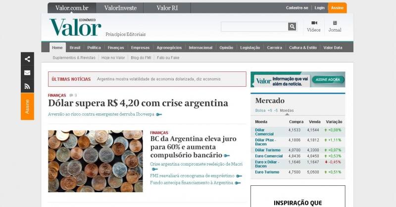 El diario brasileño Valor reporta que el dólar superó los 4,20 reales por la crisis argentina, señala el aumento de la tasa a 60% y explica que pese a la acción del Banco Central, el peso cae 12% ante el dólar. A primera hora de hoy, titulaba "Crisis económica amenaza reelección de Macri en 2019".