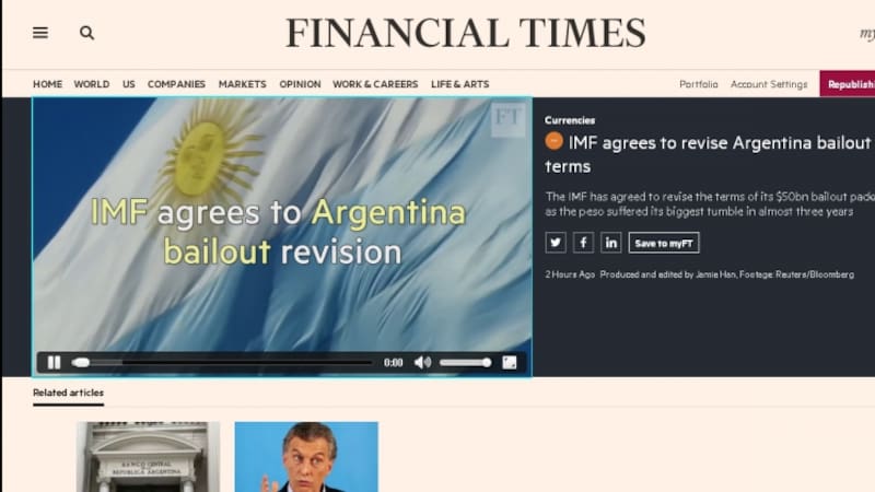 El Financial Times británico le dedica una extensa cobertura a la situación actual argentina, con cuatro notas hoy que señalan que "el FMI revisará el programa de rescate a Argentina tras la caída del peso. El presidente Macri pide adelantar el desembolso de fondos mientras crece la preocupación por el refinanciamiento". "Argentina sube la tasa a 60%. El Banco central actúa después de que se reanuda la fuerte venta masiva de pesos en las primeras horas de la jornada".