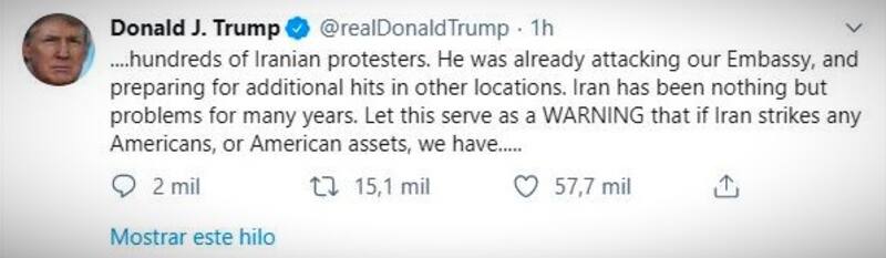 "Ya estaban atacando nuestra embajada y preparándose para ataques adicionales en otros lugares.Irán no ha sido más que problemas durante muchos años. Deje que esto sirva como advertencia de que si Irán ataca a cualquier estadounidense o activo estadounidense, tenemos en la mira 52 objetivos iraníes", remarcó.