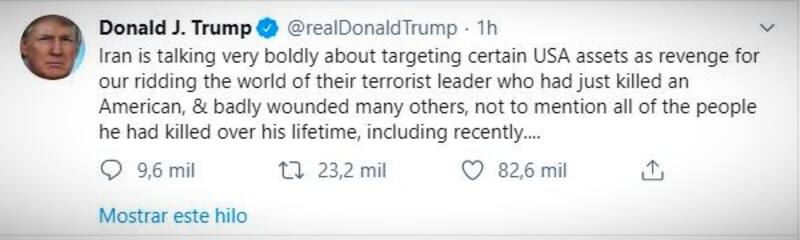 Trump se quejó porque "Irán está hablando audazmente sobre atacar ciertos activos de los EE.UU." para vengarse por el asesinato del mayor general iraní Qasem Soleimani, el jueves pasado.