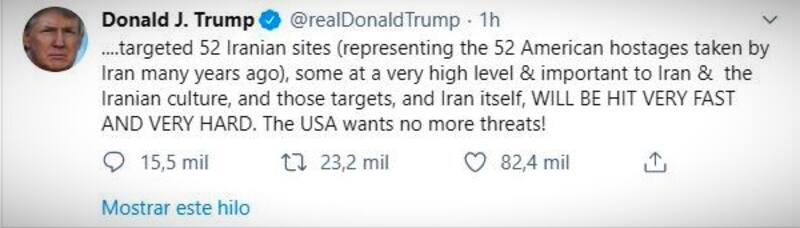 “Que sirva como una advertencia, que si Irán ataca a cualquier estadounidense u objetivo estadounidense, tenemos en la mira a 52 sitios iraníes(que representan a los 52 rehenes estadounidenses que Irán secuestró hace muchos años),algunos de muy alto nivel e importancia para Irán y la cultura iraní, Y SERÁ MUY RÁPIDO Y MUY FUERTE", escribió el mandatario en su cuenta de Twitter.