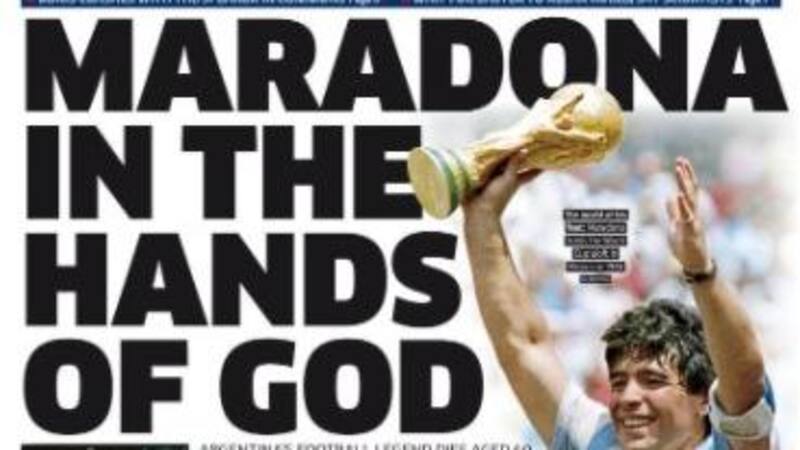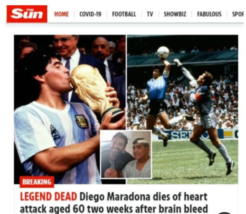 El diario The Sun se refirió a Maradona como una "leyenda" y recordóla foto de La Mano de Dios. "Diego Maradona murió: la leyenda argentina muere de un ataque al corazón a los 60 años dos semanas después de una hemorragia cerebral", expresó.