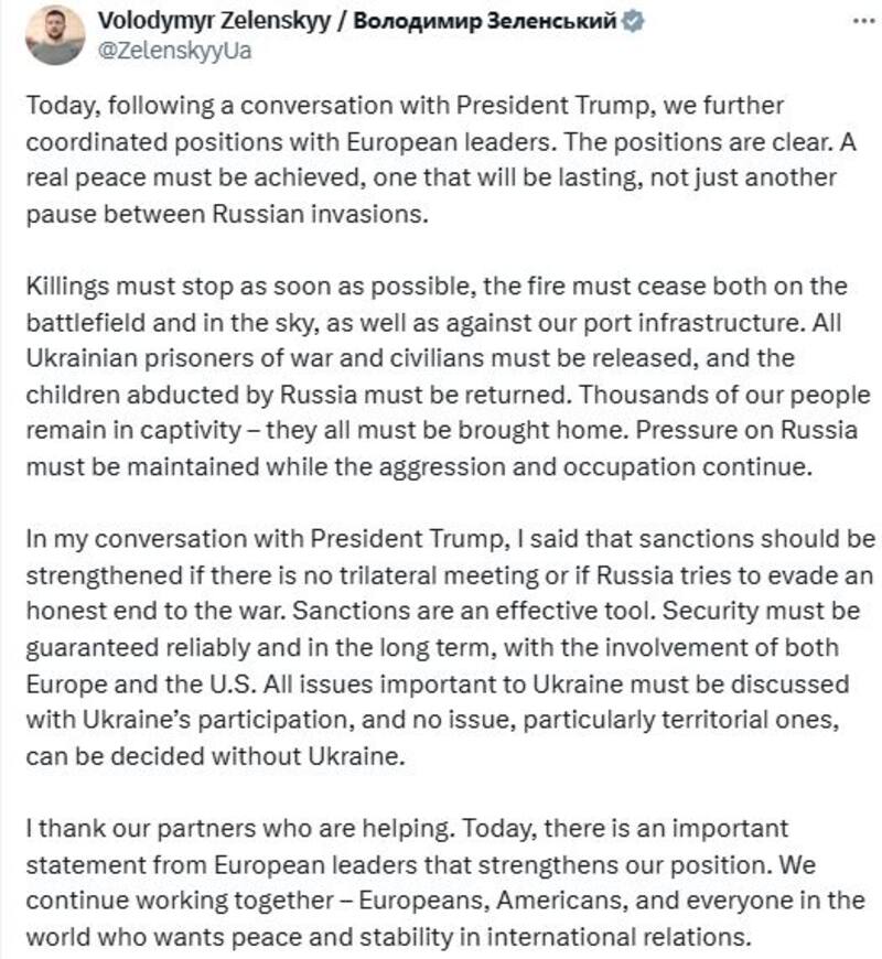 "Las posturas son claras: debemos lograr una paz verdadera, una paz duradera, no solo una pausa más entre invasiones rusas", expresó el líder ucraniano en un extenso texto publicado en sus redes.