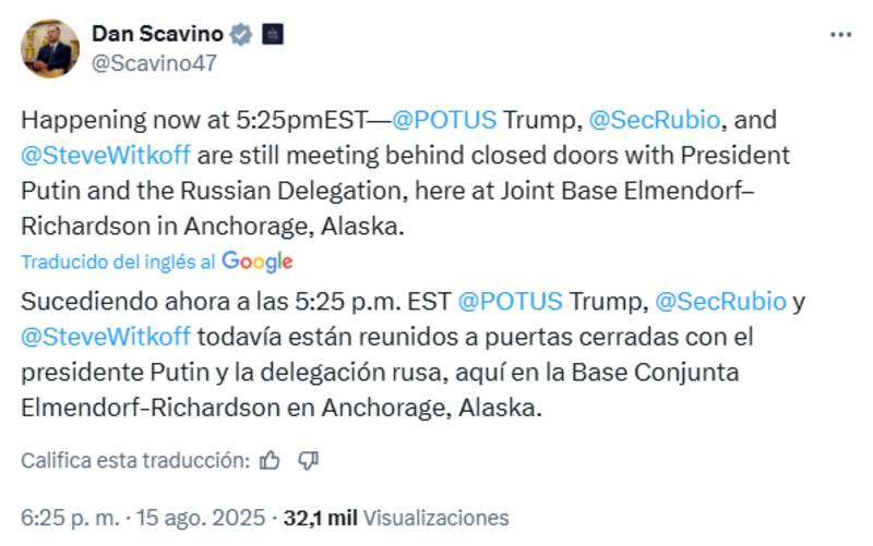 Cuando se están por cumplir dos horas desde el inicio de la reunión, el subjefe de gabinete de la Casa Blanca, Dan Scavino, publicó en X que los dos mandatarios junto a sus equipos "siguen reunidos a puerta cerrada" en Alaska.