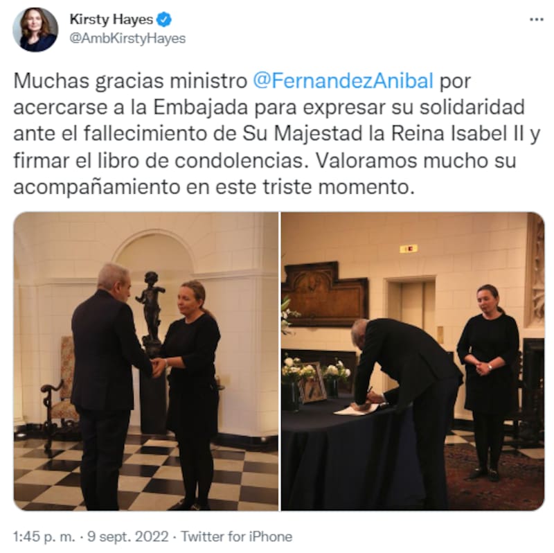 La imagen del momento y un mensaje fueron compartidos en Twitter por la titular de la sede diplomática del Reino Unido en Argentina, Kirsty Hayes: "Muchas gracias ministro Aníbal Fernández por acercarse a la Embajada para expresar su solidaridad ante el fallecimiento de Su Majestad la Reina Isabel II y firmar el libro de condolencias. Valoramos mucho su acompañamiento en este triste momento".