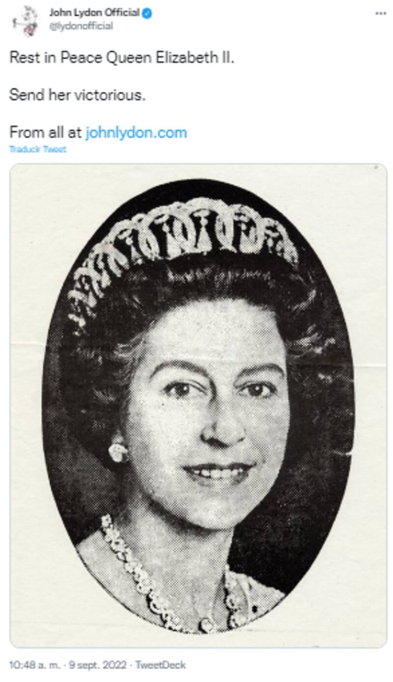 John Lydon, ex cantante de los Sex Pistols, fue otra de las celebridades que se manifestó por la muerte de Isabel II, curiosamente 24 horas luego del fallecimiento y poco después de que el himno nacional del Reino Unido cambiara su versión de "God Save the Queen" ("Dios Salve a la Reina") a "God Save the King" ("Dios Salve al Rey").
