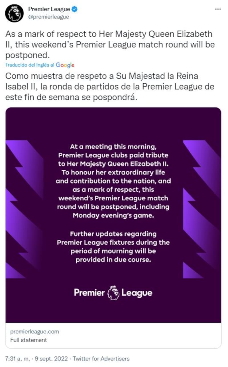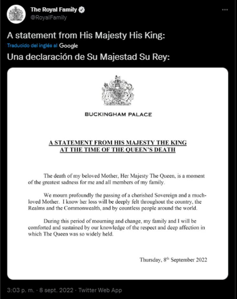 La cuenta de Twitter de la familia real británica (@royalfamily) publicó el primer comunicado del hasta hoy príncipe Carlos: "La muerte de mi amada madre, su majestad la reina, es un momento de gran tristeza para todos los miembros de la familia".
