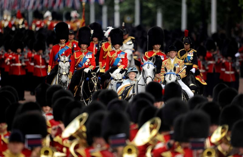 Los saludos con armas resonaron en Hyde Park, en la Torre de Londres y en los sitios militares de todo el Reino Unido cuando anunció la noticia, y los soldados con túnicas escarlata en el patio del palacio se quitaron los sombreros de piel de oso en un saludo real.