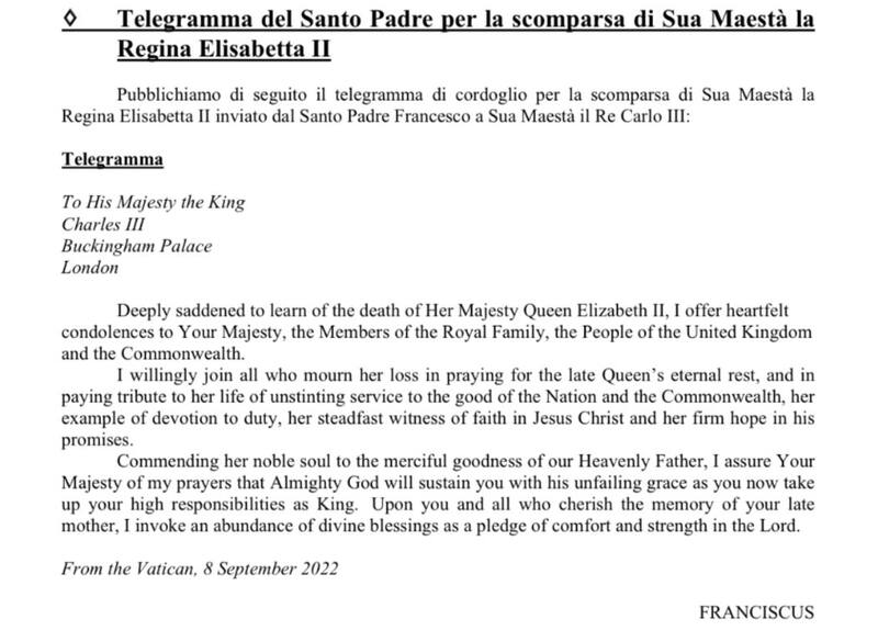 "Profundamente entristecido al enterarme de la muerte de Su Majestad la Reina Isabel II, ofrezco mis más sinceras condolencias a Su Majestad, a los miembros de la familia real, al pueblo del Reino Unido y a la Commonwealth", comienza el comunicado que envió el Papa Francisco.