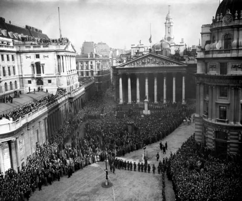 Así se veía el Royal Exchange el 8 de febrero de 1952, cuando se leyó la Proclamación de Adhesión de la Reina Isabel II.
