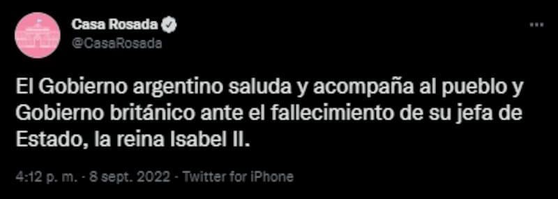 "Isabel Alejandra María Windsor (1926-2022), Reina del Reino Unido bajo el nombre de Isabel II desde 1952. El Gobierno de la República Argentina expresa su pesar por su fallecimiento y acompaña al pueblo británico y a su familia en este momento de dolor", fue la publicación del Ministerio de Relaciones Exteriores argentino en la mencionada red social.