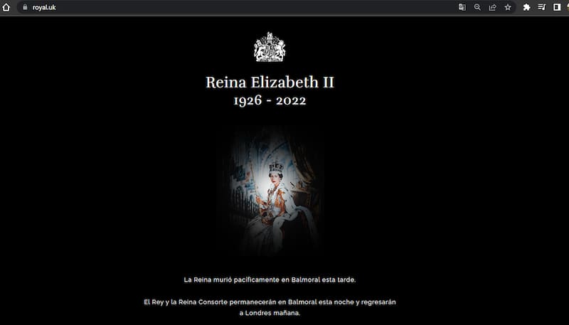 La Reina Isabel II murió este jueves 8 de septiembre a los 96 años. "El sitio web oficial de la Familia Real no está disponible temporalmente mientras se realizan los cambios apropiados", informan.