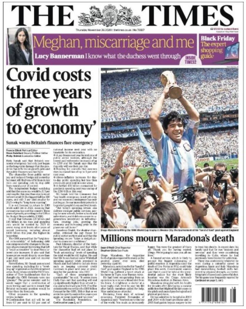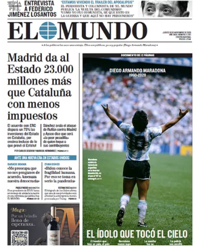 Los titulares "muere leyenda del fútbol mundial" o "el mundo llora a Maradona" se repiten en español, italiano, inglés, francés, alemán y las demás lenguas del planeta, ya que la noticia es presentada en los medios alrededor del mundo entero.