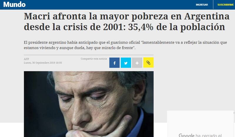“El nuevo índice de pobreza es quizá la peor noticia recibida por Macri en sus cuatro años como presidente , según consideró el diario español que además consideró que “además de ‘mirar de frente’ el incremento de la pobreza, Macri tiene que ‘mirar de frente’ hacia unas elecciones, el 27 de octubre, en las que, si se confirman las tendencias mostradas por las primarias del 11 de agosto, se arriesga a sufrir una amplia derrota .