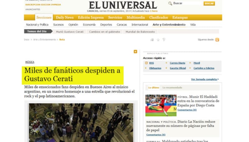 En España, también fue noticia la muerte de Cerati en el diario El Mundo y El País tituló: Cerati, el músico que modernizó y popularizó el rock en América Latina.