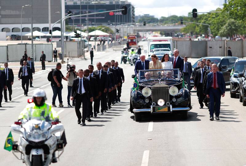 El presidente electo Luiz Inácio Lula da Silva (PT) y su esposa Rosângela da Silva, Janja, partieron de la Catedral Metropolitana de Brasília rumbo al Congreso Nacional en el tradicional Rolls Royce convertible utilizado por el Jefe del Ejecutivo el día de la inauguración.