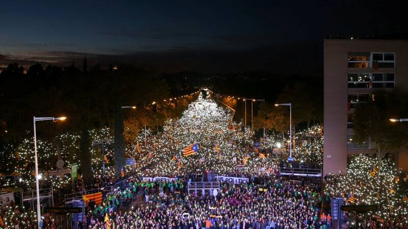 Miles de personas colmaron hoy las calles del centro de Barcelona para reclamar por la liberación de dos líderes independentistas y ocho exconsejeros del Gobierno catalán detenidos preventivamente por el plan soberanista en la región.