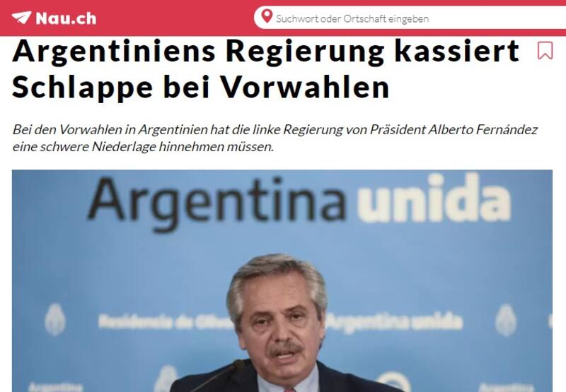 El medio suizo Nau señaló que "el gobierno de izquierdas del presidente Alberto Fernández ha sufrido una dura derrota en las elecciones primarias de Argentina".