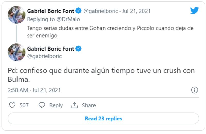"Tengo serias dudas entre Gohan creciendo y Piccolo cuando deja de ser enemigo", indicó Boric tras imponerse en la primera vuelta. "Confieso que durante algún tiempo tuve un crush con Bulma", agregó.
