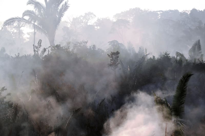 Smoke billows during a fire in an area of the Amazon rainforest near Humaita, Amazonas State, Brazil, Brazil August 14, 2019. Picture Taken August 14, 2019. REUTERS/Ueslei Marcelino