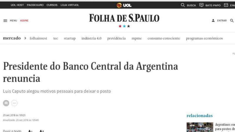 Folha de Sao Paulo también contextualizó la noticia de la dimisión con el paro, al reportar que "en medio de la huelga general en Argentina, y mientras la cúpula del gobierno de Mauricio Macri está en los EE.UU. para participar del encuentro en la ONU y renegociar la deuda con el FMI, el presidente del Banco Central, Luis Caputo, presentó su renuncia".